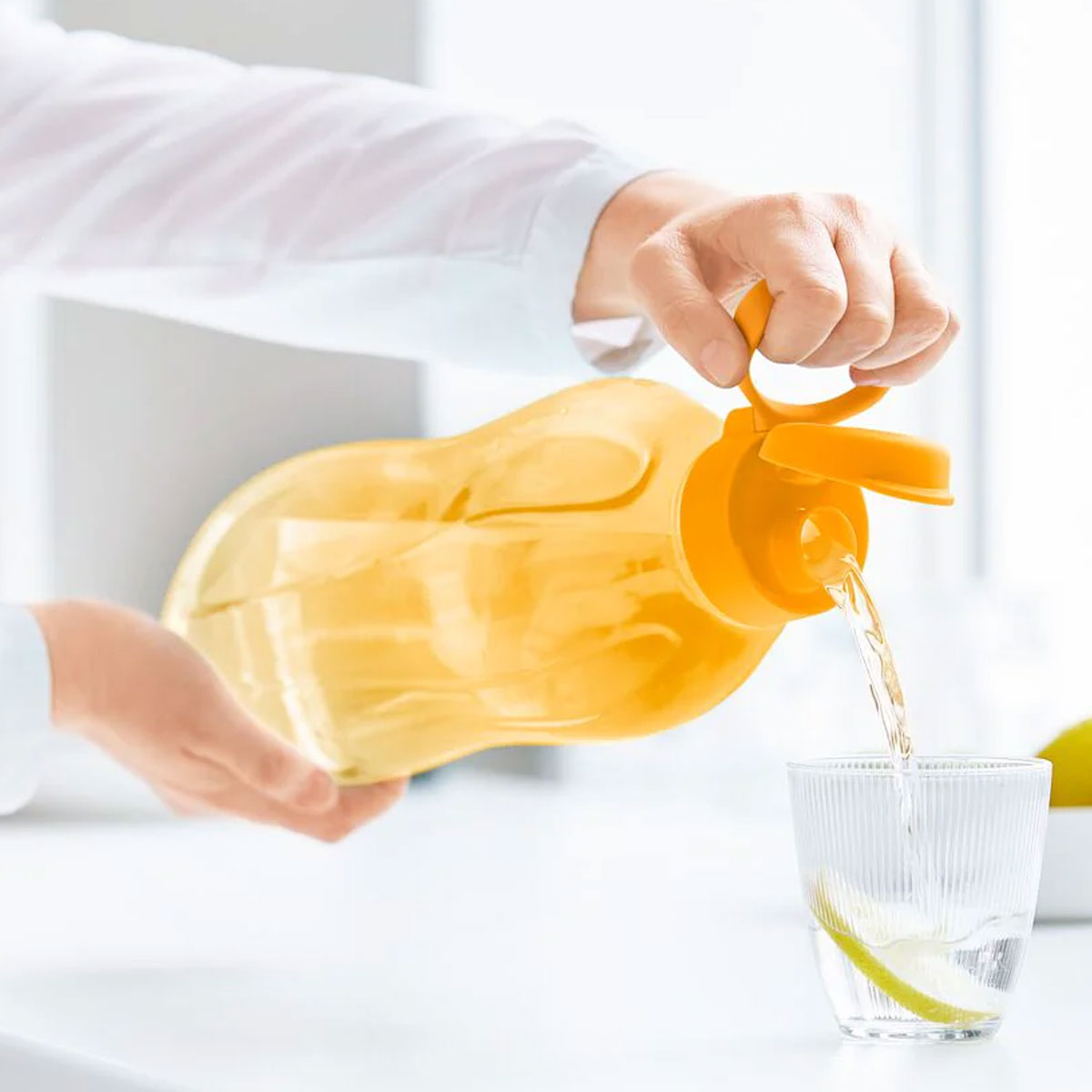 Tupperware Eco bottle with a volume of 2 liters is a cost-effective and sustainable solution for drinking water and other cold drinks throughout the day. The shape of the bottle allows it to be stored in the refrigerator door, and the mouthpiece is comfortable and easy to drink, even while moving. The bottle is transparent so that its contents can be seen, and its ergonomic design allows you to drink and pour from it comfortably.