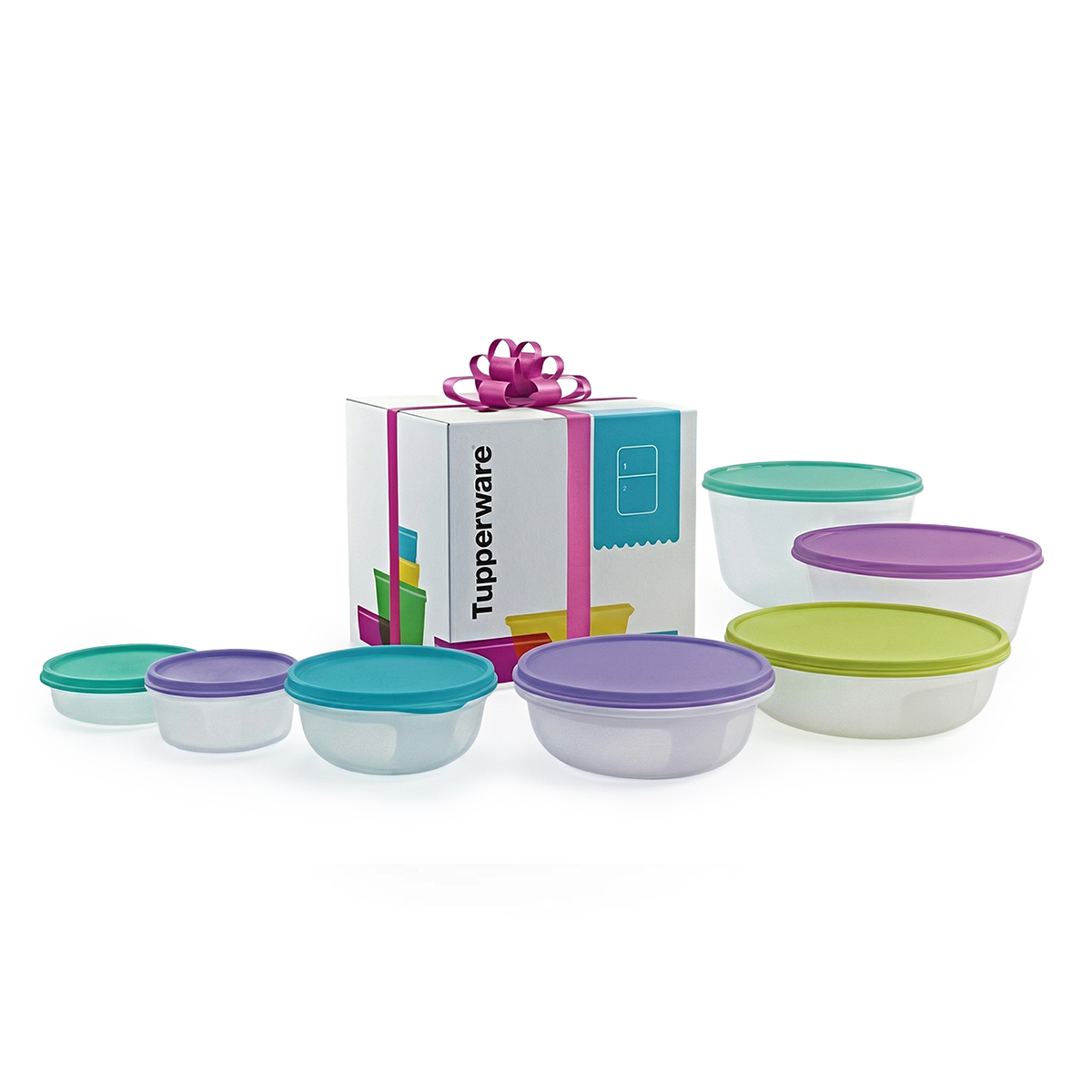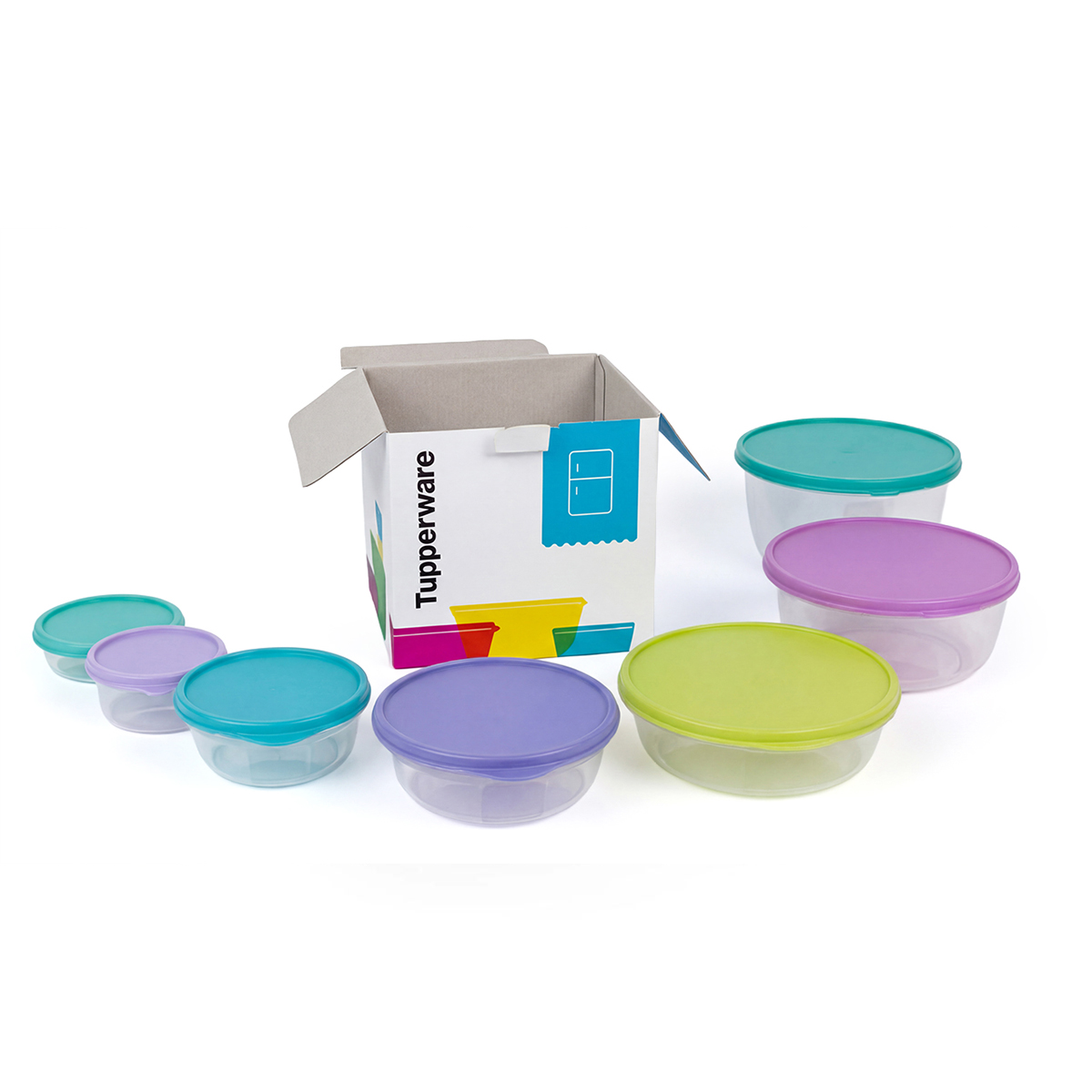 This is a boxed set of Tupperware bowls in different capacities, all with a classic round seal which is air-tight and water-tight. Can be used to store food in fridge or transport it on the go. It is transparent so you can see its contents without opening it. Set consists of 7 pieces